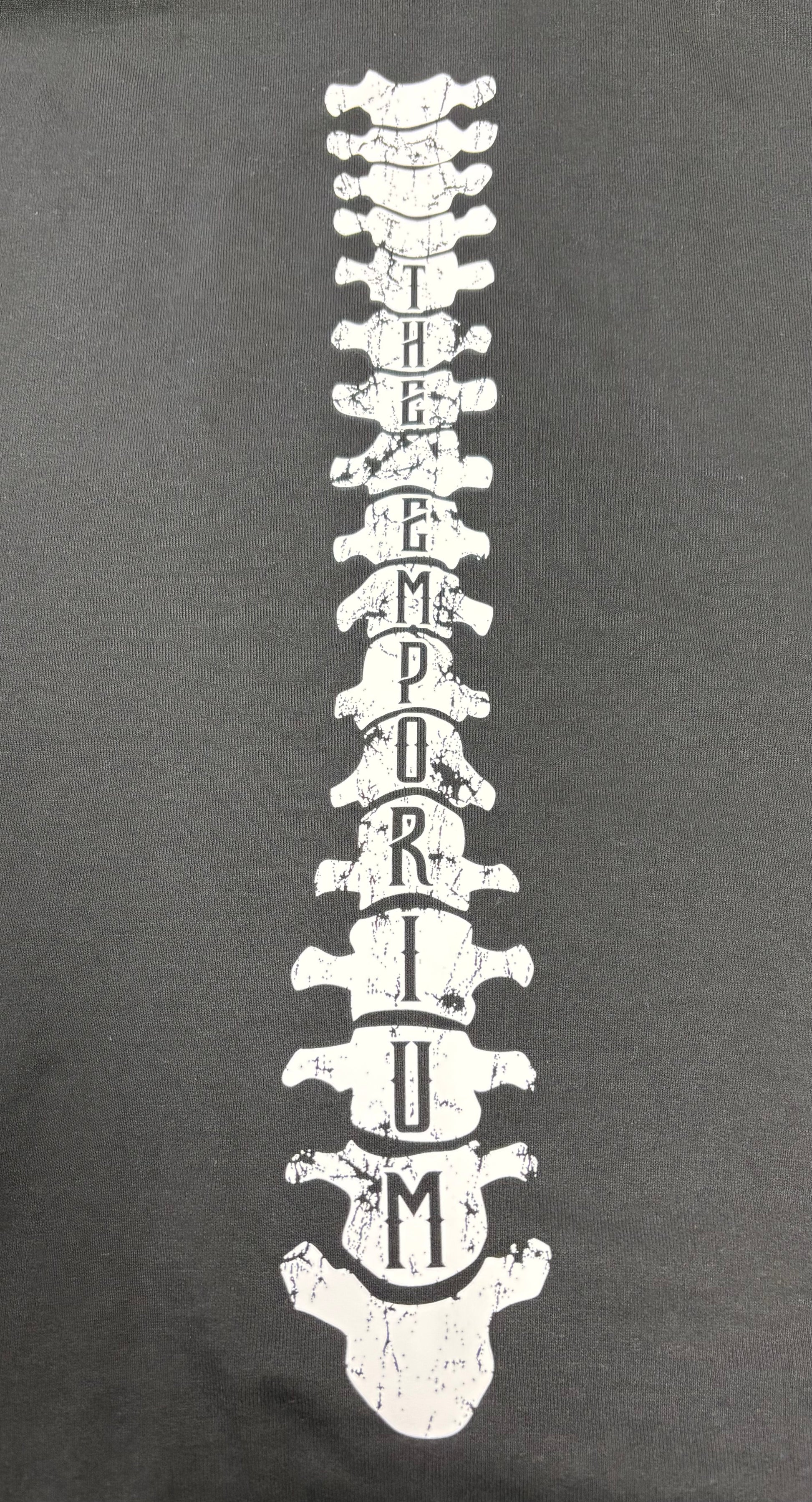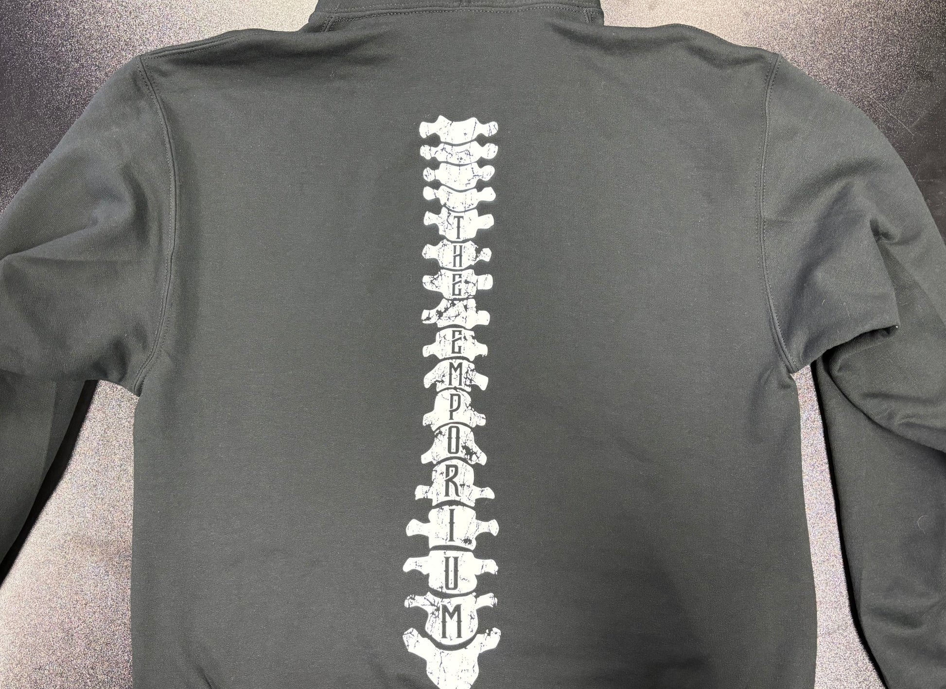 Awesome hoodie featuring our logo with arm bones and a wicked spine design, with "The Emporium" spelled out in the vertebrae.